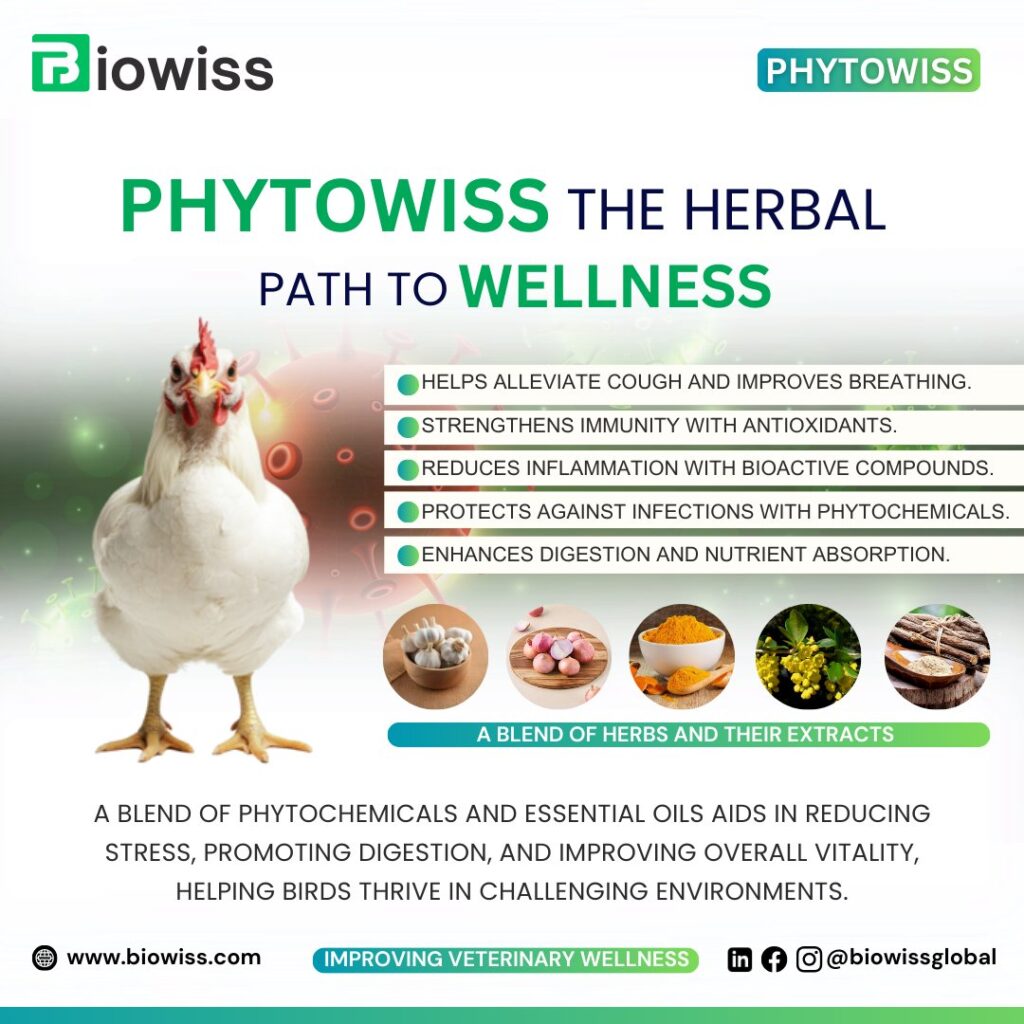 PHYTOWISS The Herbal Path to Wellness A blend of phytochemicals and essential oils aids in reducing stress, promoting digestion, and improving overall vitality, helping birds thrive in challenging environments.